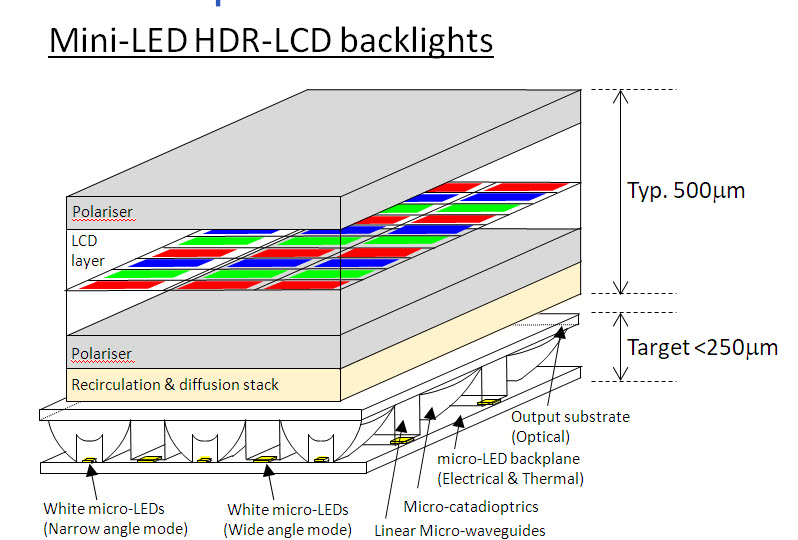 The challenge with Mini-LED technology comes down to a cost/benefit tradeoff. To get anywhere close to the contrast ratio of OLED, mini-LED LCDs need more than 10,000 individual chips and an active matrix backplane to drive a high-performance backlight. This backlight backplane is needed in addition to the primary backplane already used to drive the LCD pixels. The result is a display that looks better than traditional LCD but not as good as OLED—with a cost that’s at least as high as OLED today. Mini-LED LCDs retain the other deficits versus OLED—a lower color range, slower response times and a thicker form factor.