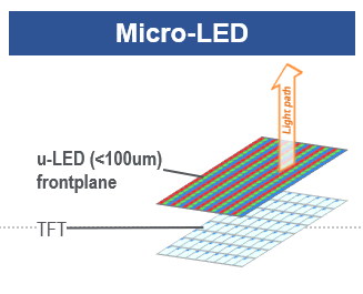Whereas mini-LED is just an LCD backlight enhancement, micro-LED is a self-emitting display technology (like OLED) using LEDs less than 50-100 microns in size, each becoming an individual red, green or blue sub-pixel (see Figure 3). Micro-LED technology matches or exceeds OLED and LCD in almost every performance area. It has the image quality and form factor benefits of OLED without the robustness and lifetime issues. It exceeds LCD and OLED in terms of brightness and also has lower power consumption. Micro-LED is indeed the “holy grail” of displays..