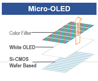 Micro-OLED is another interesting technology emerging in displays. It enables very high resolution (greater than 1,000 pixels per inch) and can be used in near-eye applications like virtual and augmented reality (VR/AR). Micro-OLED can be manufactured with a frontplane similar to the White OLED (WOLED) technology used in TVs today (blanket OLED layers are evaporated onto a substrate to emit white color; then a color filter renders the light red, green or blue). But to enable the high resolution and small pixels, the backplane is built on silicon wafers using semiconductor manufacturing technology (see Figure 4). Micro-OLED is a viable technology, but its application is expected to be limited to small, near-eye or projected displays, and we do not expect it to challenge conventional OLED for mainstream applications.